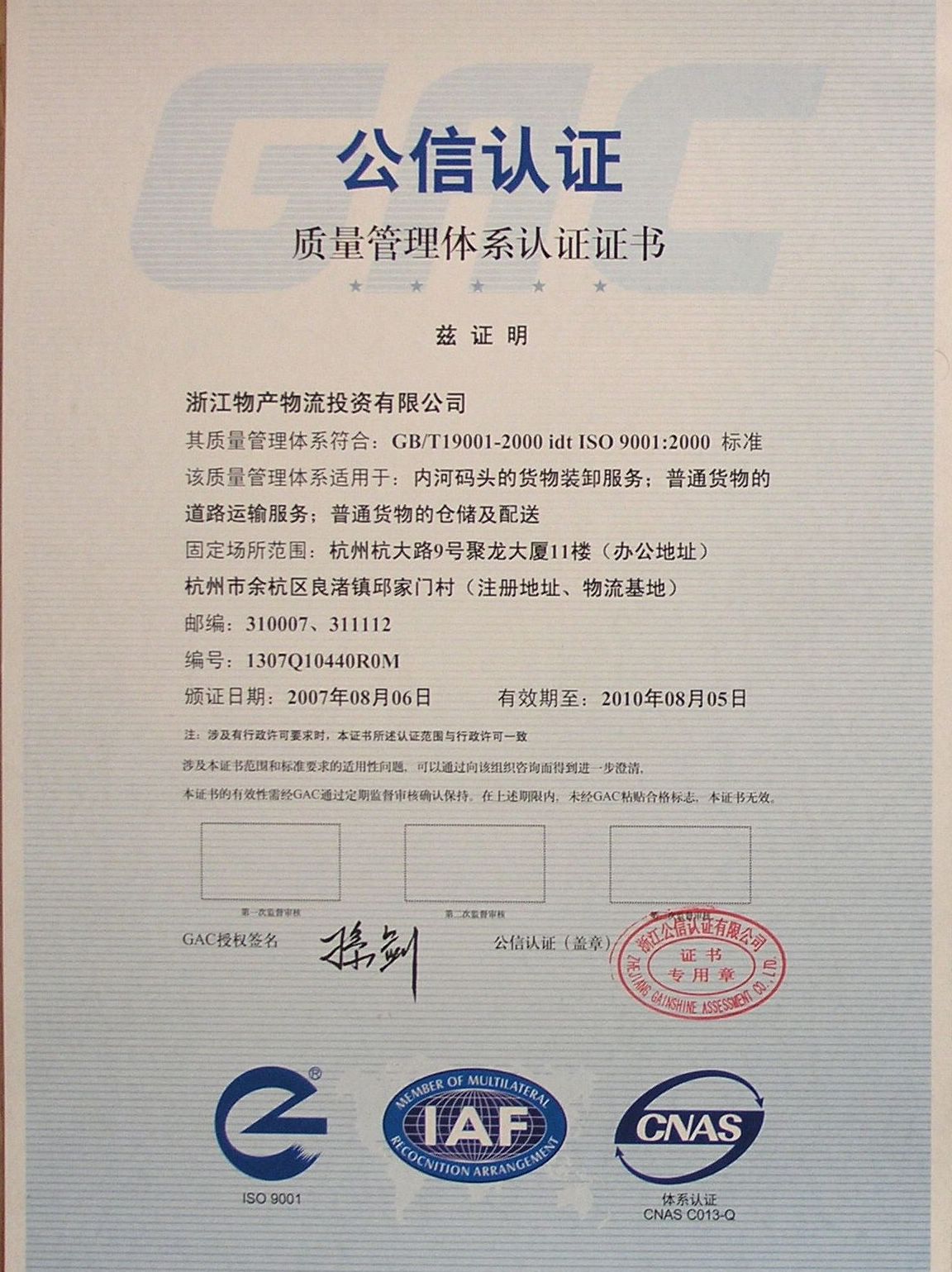 继6月底通过现场审核后,浙江物产物流投资有限公司于日前通过了国家认可委员会(CNACR)的复审,最终获得了ISO9001:2000《质量管理体系认证证书》。此举标志着物产物流公司在质量控制、服务意识、规范管理等方面迈上了一个新台阶,也标志着在打造“精品物流基地”方面取得了新的进步,为公司争取4A级物流企业创造了有利条件。 (蒋京丹)