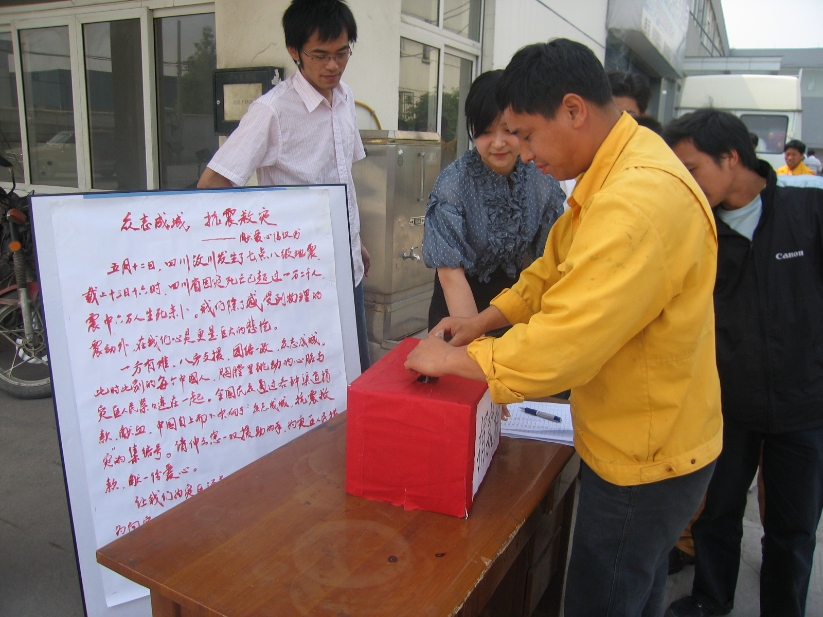 5月22日的募捐仪式,是在公司连续几天募捐后举行的。此前,员工们已捐出了30余万。此次募捐,员工们还是非常踊跃。公司下属企业有很多员工来自农村,家庭负担非常重,但他们说:灾区人民比我们更困难。有些员工不愿留下名字,却用质朴的言语表达了心声:“灾区人民在受苦,我们这样做是应该的”。这一次,物产金属的员工又捐出了40余万元。