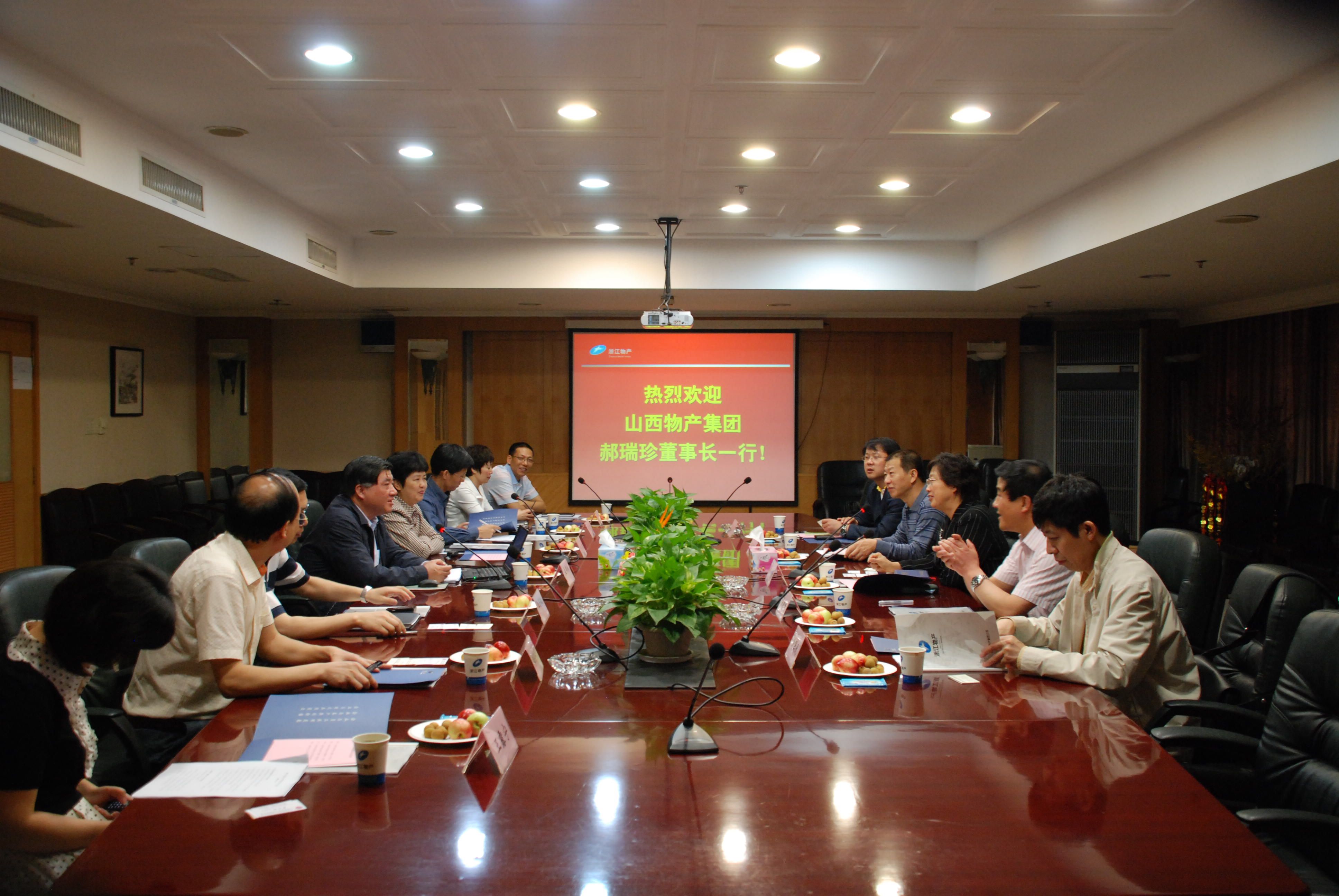 5月12日,山西省物产集团郝瑞珍董事长(右中)等一行前来我集团考察交流。受胡江潮董事长的委托,孟伟林总经理、陈敏副总经理热情接待了郝董事长一行并向客人简要介绍了浙江物产的改革发展情况。集团有关成员公司及总部有关部门负责人参加了见面交流会。   (本报记者)
