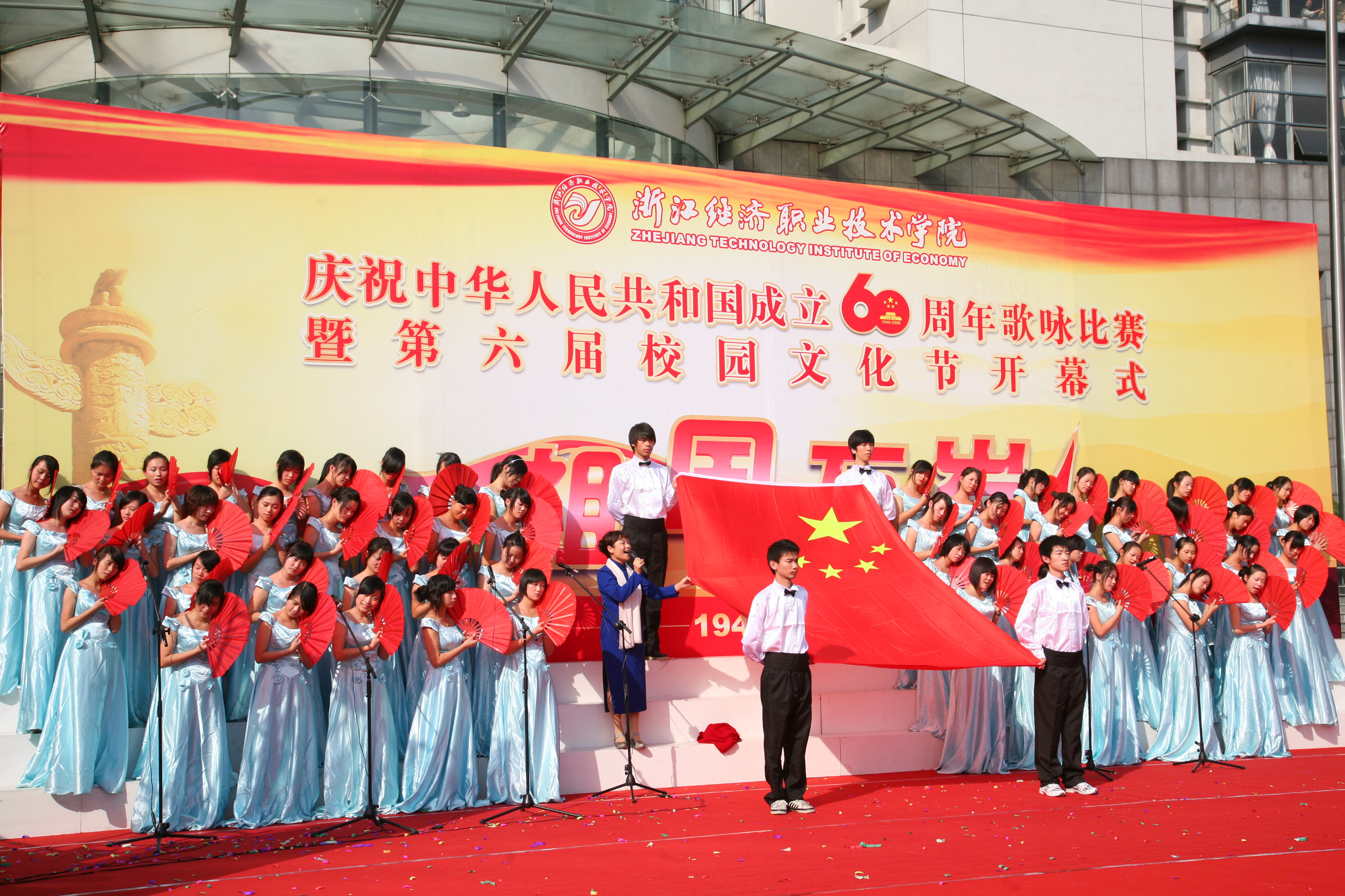为庆祝中华人民共和国成立60周年,浙经院组织开展了多形式、全方位的“我爱我的祖国”主题庆祝活动,营造了学生、班级、二级学院(部)、学校四级联动、层次分明的喜庆氛围。在新中国迎来60岁生日之际,浙经院的学生们不约而同地把手机彩铃换成了《歌唱祖国》,以表达对祖国的祝福;各个班级深入开展“我心中的祖国”主题班会,在激扬文字、挥斥方遒中表达赤子之情;二级学院(部)积极组织师生观看庆祝中华人民共和国成立60周年大会和阅兵式,同时,还组织了丰富多彩的庆典活动,有“我爱我的祖国”征文比赛、“祖国历程”红色经典影视作品展播,“歌唱祖国”教职工歌咏活动等;学院党委则将庆祝新中国成立60周年活动作为今年的重点工作之一,组织举办了“祖国万岁”大学生合唱节,形成了班班有歌声、人人唱红歌、师生共参与的喜庆气象;同时,以展示近年来学院师生优秀书画作品的“庆祖国六十华诞”文化艺术教育成果展也在学院全面展开。
