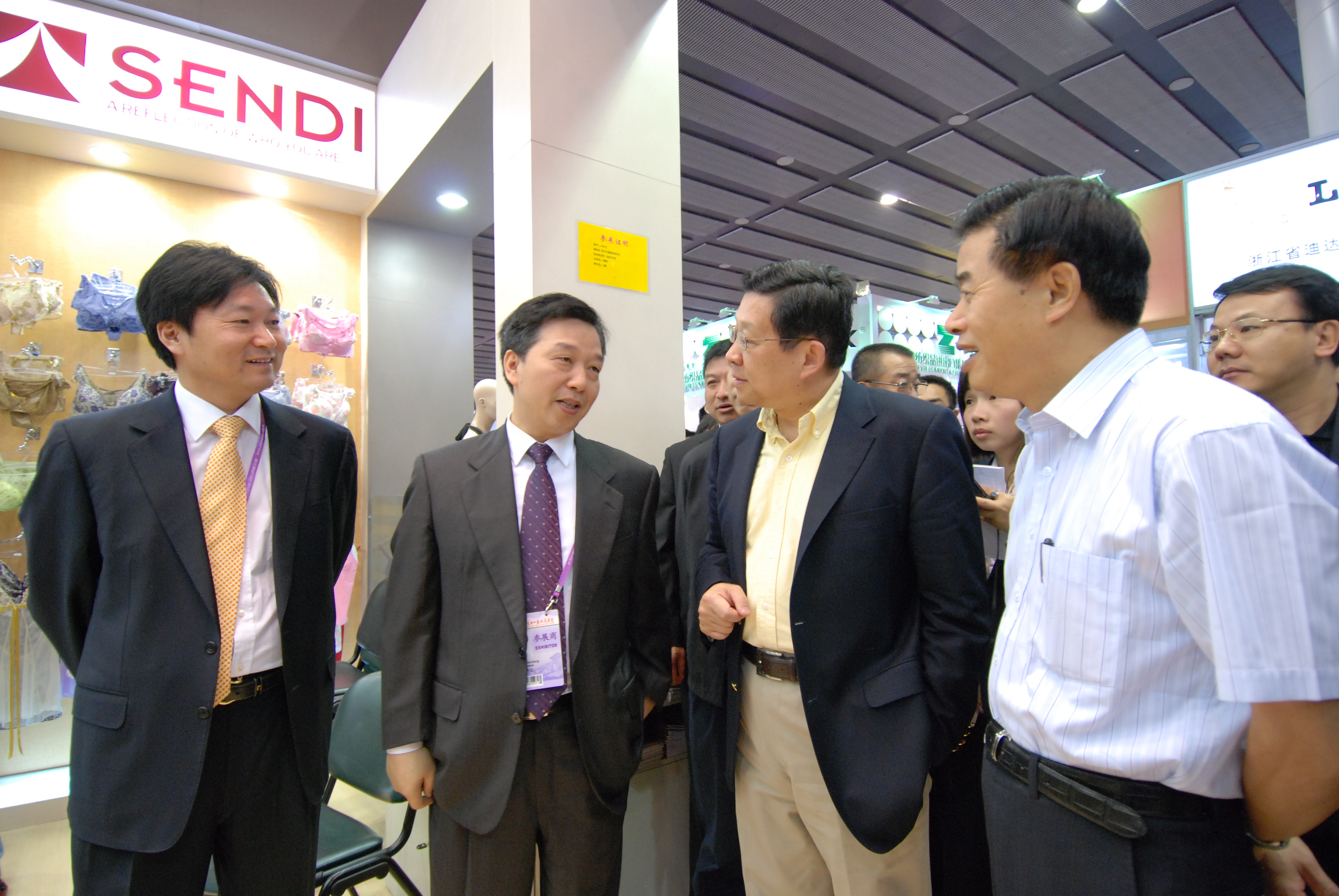 在刚刚结束的第106届广交会上,我集团所属中大股份公司共设男女装品牌、男女装、家访、纺织面料、裘皮羽绒展位等各类展位23个,成交金额计2015万美元,比上届增长5%,参展工作取得了预期的效果。参展期间,正在视察第106届广交会第三期展会的商务部部长陈德铭和广东省省长、广交会主任黄华华,在商务部副部长、中大股份首任董事长钟山等的陪同下,来到了中大股份公司的男女装品牌展位考察了解情况。陈德铭、黄华华十分关心客商参会和成交情况,陈德铭部长还向中大股份陈继达董事长了解了企业参展情况,仔细询问了参展广交会第三期展会对企业年底服装出口订单的影响等,并勉励公司加大自有品牌出口力度。图为中大股份公司陈继达董事长、许应成总裁在向商务部陈德铭部长等领导介绍公司情况。(童昌华)