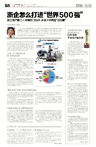 在这份全新的世界500强榜单上,浙江省物产集团公司以2010年营业收入1353.9亿元人民币(折合200.01亿美元,按去年平均汇率1:6.7692计算),首次进入世界500强,7月7日20时,美国《财富》杂志公布了今年世界500强的榜单,等待榜单消息多时的浙江物产集团高管、员工们集体兴奋,浙江企业入围世界500强企业“零的纪录”在那一刻被打破。位列榜单中的第483位,浙江物产集团公司也成为浙江省第一家进入世界500强的企业。